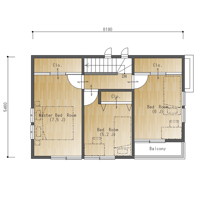 二階の主寝室は一間半のクロゼットを付け、寝室空間だけで7.5帖を確保してなるべく大きな部屋にしました。子供部屋のひとつにはバルコニーを置くために建物が凹んでいますが、建蔽率・容積率に問題がなければ拡げて大きな部屋にしても構いません。