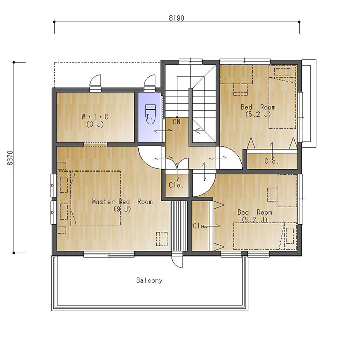 二階は三部屋。隣り合わせの子供部屋はいずれも角部屋で通風・採光に配慮されています。