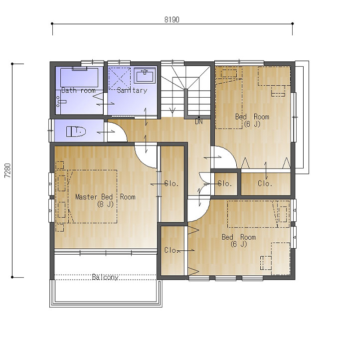 二階は子供部屋二つと主寝室の三部屋があります。すべて角部屋なので通風・採光に優れています。子供部屋はいずれも6帖のクロゼット付きです。
