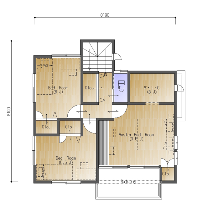 二階は主寝室と子供部屋が二部屋あります。すべて通風採光のよい角部屋です。