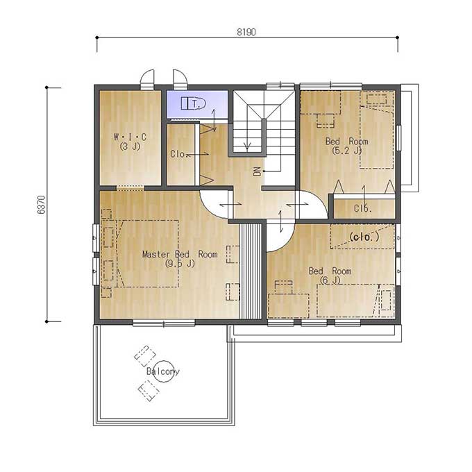 二階の主寝室は9.5帖で、それとは別に3帖のウォークインクロゼットがあります。