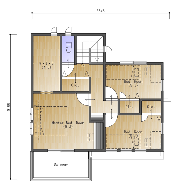 東玄関、東西の間口4.5間(8190㎜)、南北の奥行が5.0間(9100㎜)に収まる参考プランです。
