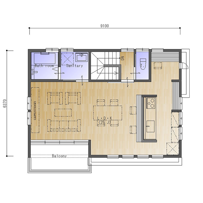 東玄関、東西の間口5.0間(9100㎜)、南北の奥行が3.5間(6370㎜)の参考プランです。