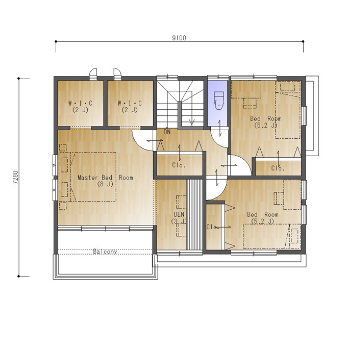 二階は三部屋。書斎のある8帖の主寝室には、2帖のウォークインクロゼットが二つあり、夫婦で使い分けることができます。