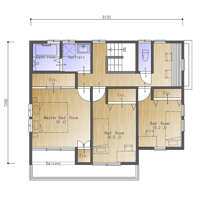 東西の間口5.0間(9100㎜)、南北の奥行が4.0間(7280㎜)の東玄関の参考プランです。