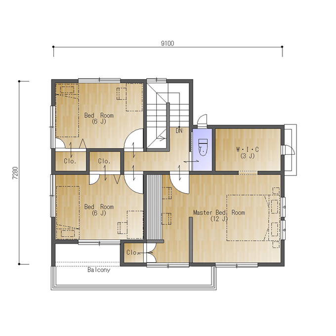 主寝室は12帖。ダブルベッドを置いてもゆとりがあります。ウォークインクロゼットと書斎コーナーを備えた充実の主寝室です。