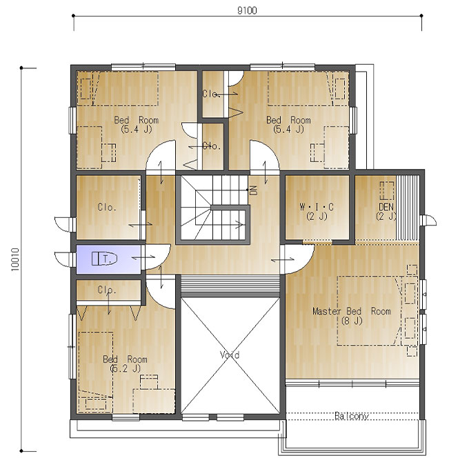 東西の間口5.0間(9100㎜)、南北の奥行が5.0間(9100㎜)の東玄関の参考プランです。