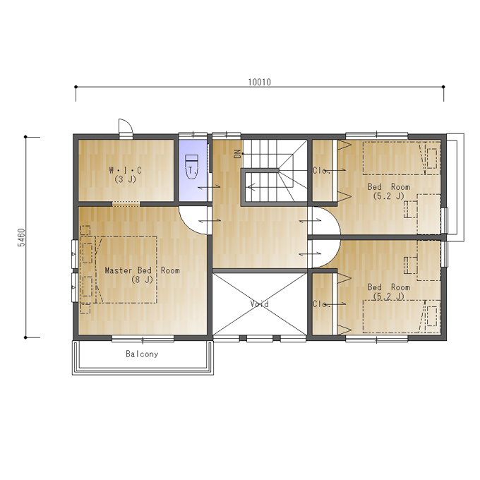 東(西)玄関で東西の間口5.5間(10100㎜)、南北の奥行が3.0間(5460㎜)の参考プランです。
