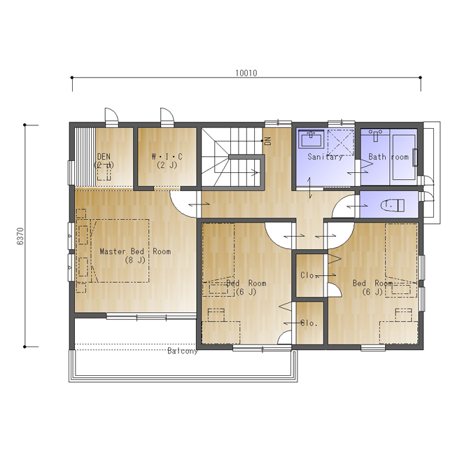リビング階段を上がった二階、主寝室に書斎とウォークインクロゼットを分けましたが、ここはひとつの大きなウォークインクロゼットに変える方も多いかもしれません。