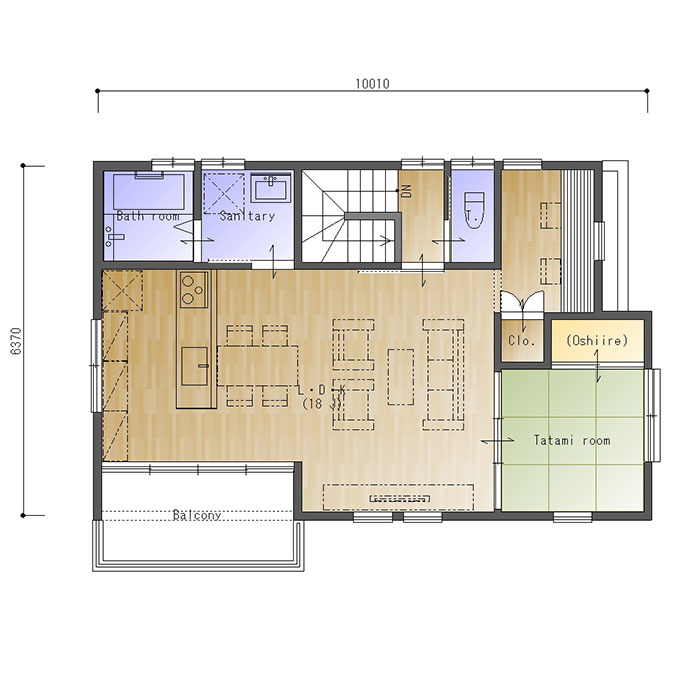 東(西)玄関で東西の間口5.5間(10100㎜)、南北の奥行が3.5間(6370㎜)の参考プランです。