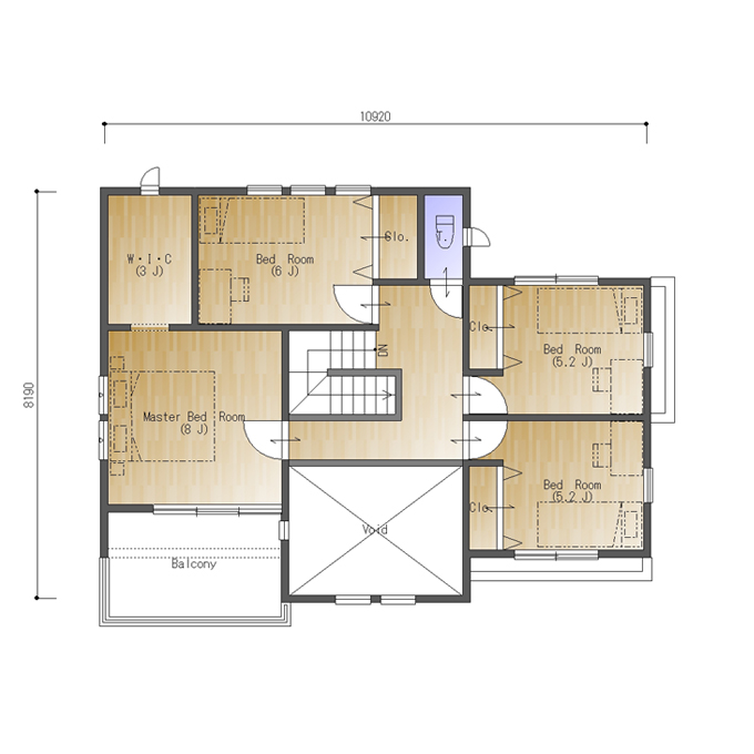 リビング上部には6帖大の大きな吹き抜けが。二階ホールから一階リビングを見下ろせる贅沢な空間です。二階も階段を中心に回遊動線になっており、主寝室へは北側からも南側からもはいれます。