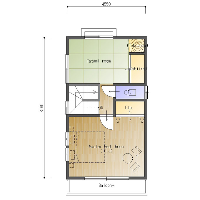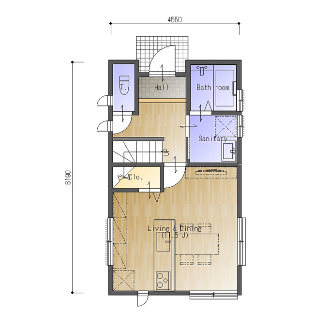 北玄関、東西の間口2.5間(4550㎜)、南北の奥行が4.5間(8190㎜)の参考プラン、コンパクトな2LDKの間取りになります。