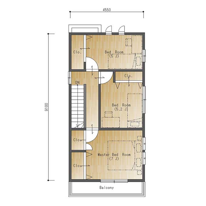 二階は南側に7帖の主寝室、5帖と5.2帖の子供部屋の三部屋を配置。各部屋に備えつけのクロゼットがあります。主寝室には間口いっぱいの南向きバルコニーがあるので、部屋全体が明るく開放的になっています。