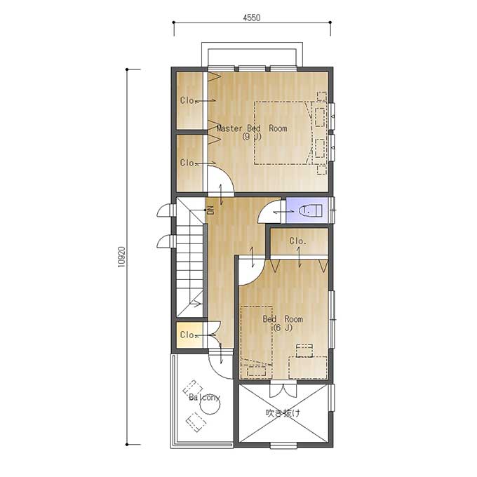 北側には8帖の主寝室。あえてクロゼットを2つに分けて設置しています。