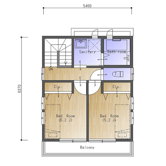 コンパクトな建物ですが、二階の各部屋にクロゼットがついています。どちらも5.2帖の部屋。バルコニーにつながる窓があるので開放感が生まれ、部屋を広く感じさせるつくりです。