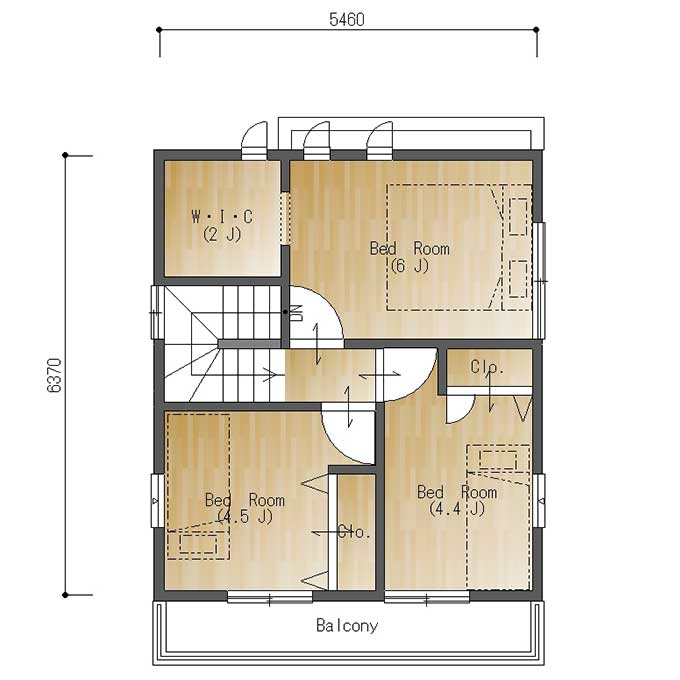 二階には三部屋を配置。スペースを有効に使えるように廊下の面積を減らし、各部屋の収納スペースを確保しました。