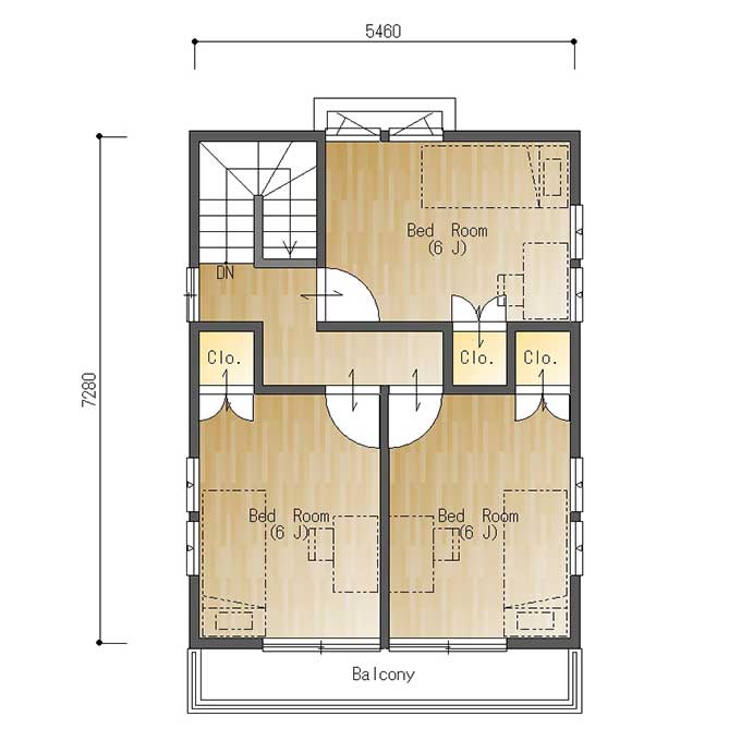2階には6畳の部屋が3部屋。できるだけスペースを有効に使うため、廊下は最小限としています。各部屋に収納があるため、タンスを部屋に置く必要がありません。空間を広く使うことができますね。また、各部屋2方角に窓があり、採光や風通しも良い作りとなっています。