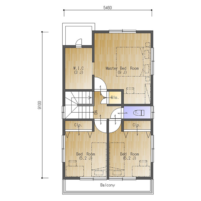 二階は三部屋。北側の主寝室は9帖。ベッドを置いても足元に余裕があり、デスクまたはドレッサーが置ける凸型のスペースがあります。3帖のウォークインクロゼットがあるので収納に困らない間取りです。