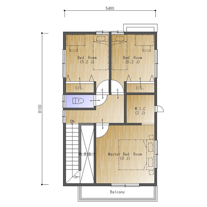北玄関、東西の間口3.0間(5460㎜)、南北の奥行が5.0間(9100㎜)の参考プランです。