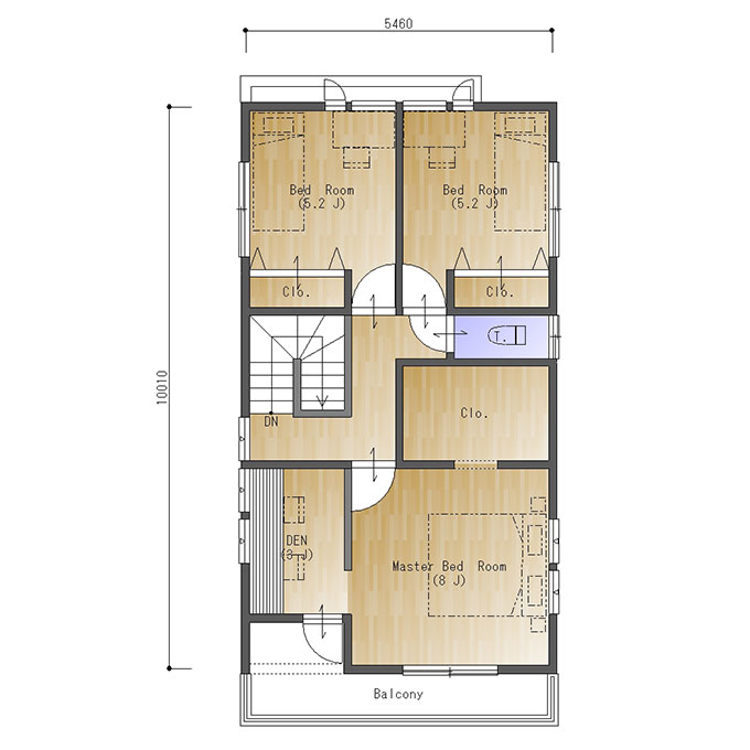 北玄関、東西の間口3.0間(5460㎜)、南北の奥行が5.5間(10010㎜)の参考プランです。