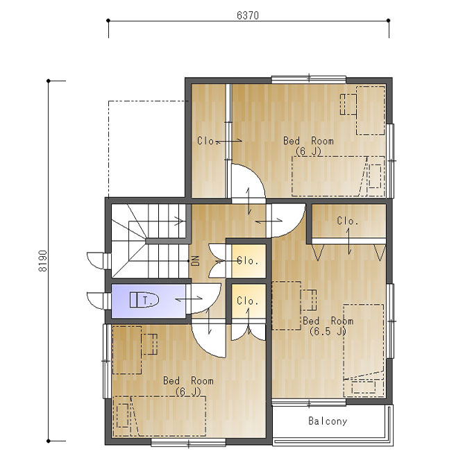 二階は6帖が二部屋、6.5帖が一部屋の計三部屋。部屋内にそれぞれ収納があります。子供部屋との間に収納を置いてプライベートを損なわないように配慮がなされた間取りです。