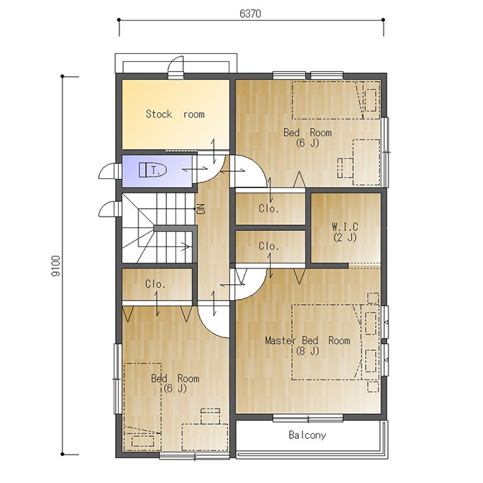 二階の主寝室は8帖で、クロゼットとは別に2帖のウォークインクロゼットもついて収納力は抜群。