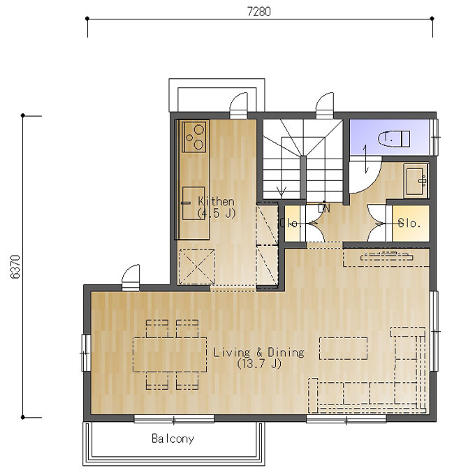 カーポートを設ける分、どうしても建物がとられてしまいますが、二階のLDKは約13.7帖と十分な広さを確保。間口いっぱいにスペースを使って、ほどよいバランスで家具を配置することができます。