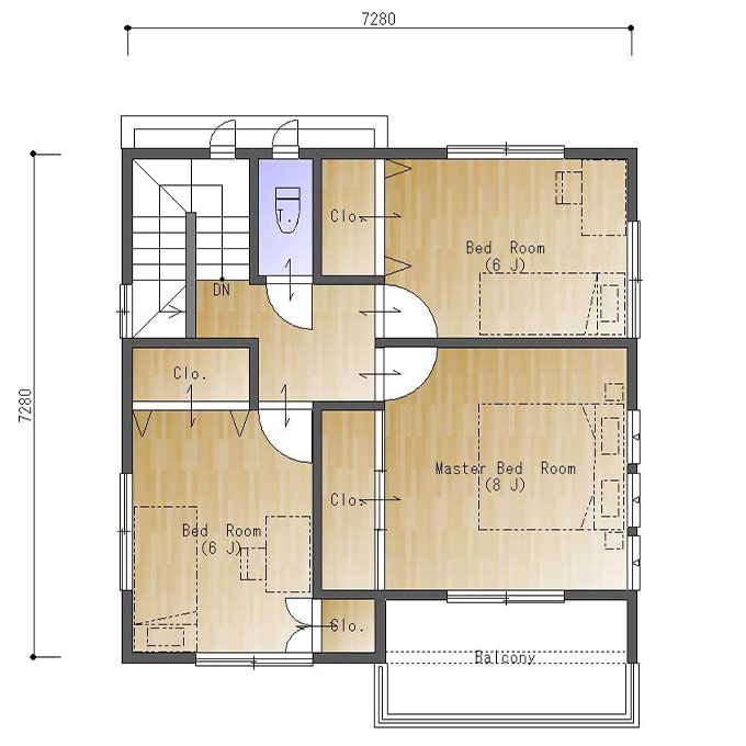 北玄関、東西の間口4.0間(7280㎜)、南北の奥行が4.0間(7280㎜)の参考プランです。