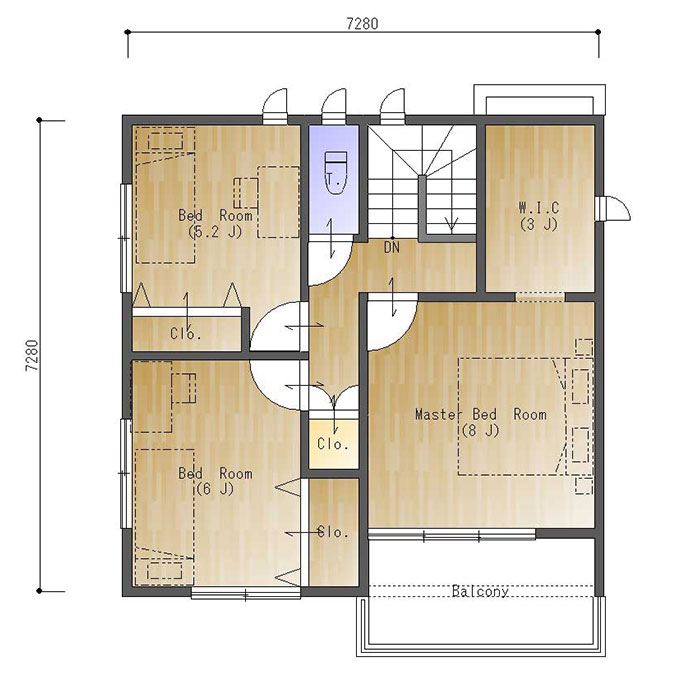 主寝室は8帖あり、3帖のウォークインクロゼットもついています。ご夫婦の衣類も余裕で収納でき、季節によって使わない寝具類なども納めることが可能です。