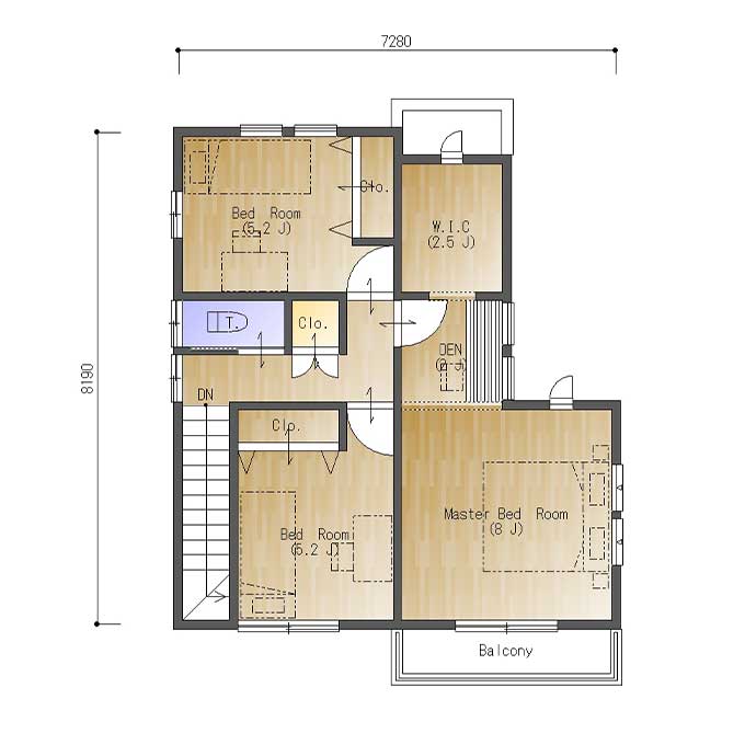 二階は主寝室と子供部屋が二部屋のプライベートルームを配置。主寝室は、2.5帖のウォークインクロゼットと2帖の書斎を別にして8帖の広さを確保しています。バルコニーがあるのでより開放感が感じられる寝室です。