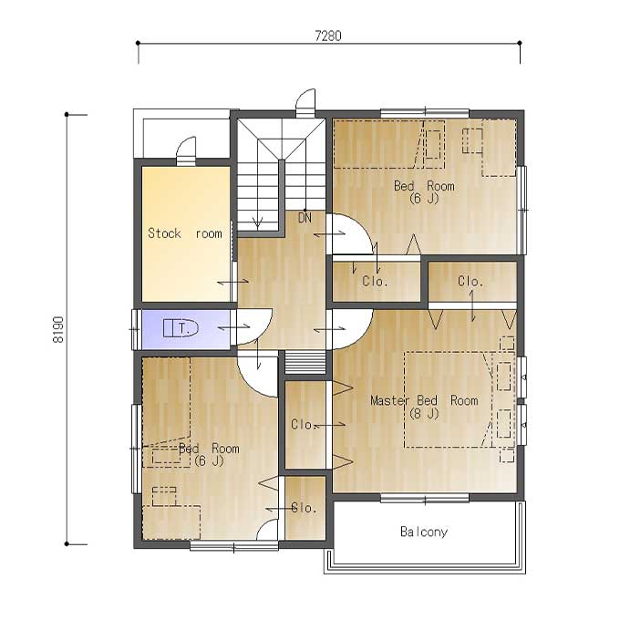 二階には主寝室と子供部屋が二部屋あります。主寝室は8帖。南向きのバルコニーに面しているので明るく開放感に溢れた部屋になっています。子供部屋はそれぞれ6帖。備え付けのクロゼットがある角部屋で、窓が二面あるため、広さと採光を配慮した設計になっています。各部屋にクロゼットがありますが、さらに納戸も設置されているので季節ものの収納もばっちりです!