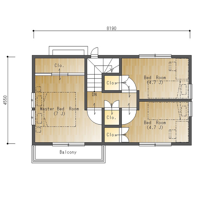 二階には3つの部屋を配置。机や本棚を置いてもベッドが置ける子供部屋はいずれも角部屋にして、通風・採光に配慮しました。各部屋に専用クロゼットがあるので、部屋を有効に使えます。主寝室にはバルコニーが設けてあり、明るく開放感のある部屋になっています。