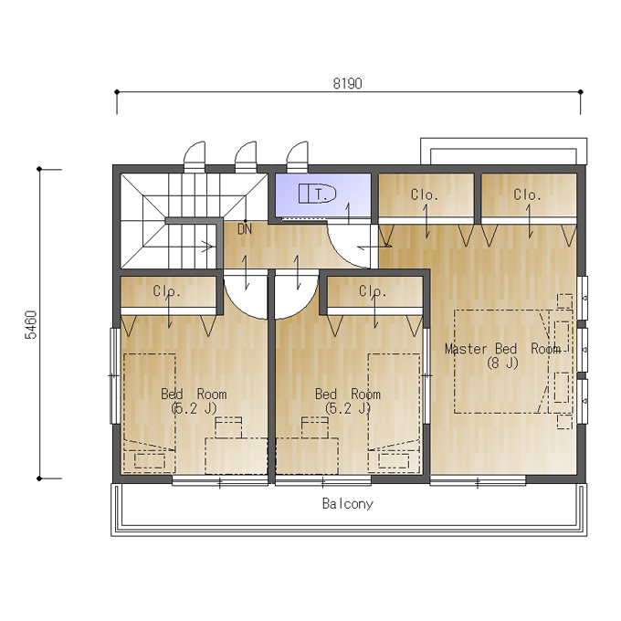 2階の主寝室は8帖あります。またクローゼットが2間分あるため、洋服などをしっかり収納できます。バルコニーは2階の3部屋とつながっており、南向きの4.5間(8190㎜)の間口を有効に使っているので、洗濯物もしっかり干せそうです。