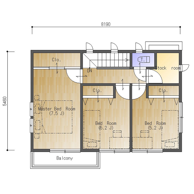 二階は子供部屋が二つと主寝室、そしてストックルームがあります。子供部屋はそれぞれ5.2帖、主寝室は7.5帖。全ての部屋に備え付けのクロゼットがあります。独立したストックルームには、共有の荷物や季節外れの洋服・小物を収納することができ、収納を重視しています。