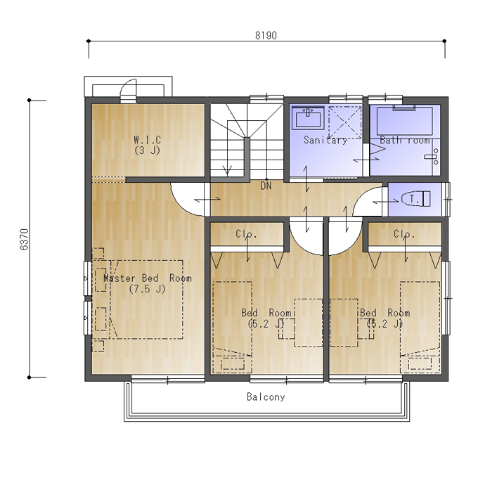 二階には子供部屋が二つと主寝室があります。子供部屋はそれぞれ5.2帖。主寝室は7.5帖、さらに3帖のウォークインクロゼットがついています。すべての部屋が南側のバルコニーに面しているので、開放感に溢れますね。