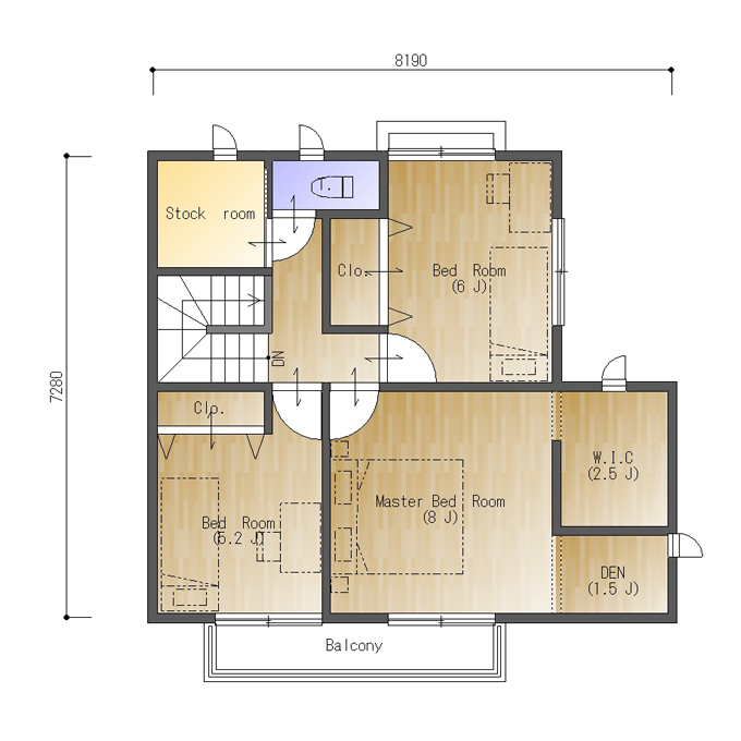 二階にも約2帖のストックルームがあり、家族の荷物をしっかり収納できます。二階の子供部屋は5.2帖と6帖、それぞれ収納もついています。南側の部屋はバルコニーにつながっているため明るい光が取り込めそうです。