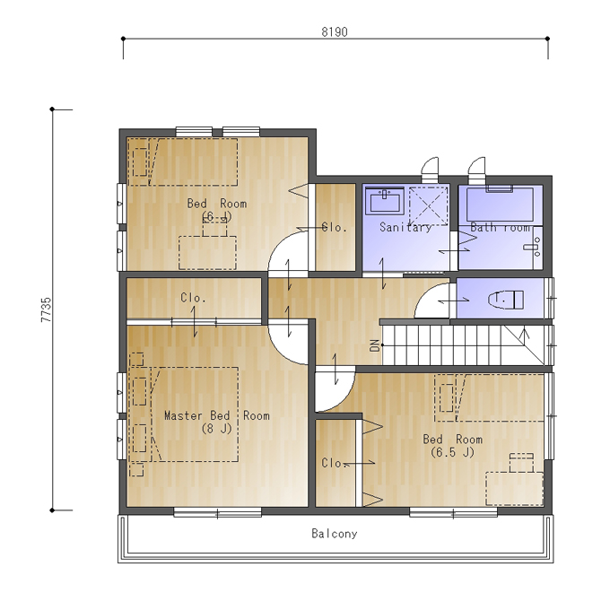二階はホールを小さく作り、子供室を含む三部屋と浴室洗面を配置。主寝室は8帖、他に6帖と6.5帖の子供室には、それぞれクロゼットがついています。そのすべてが角部屋で、通風採光がしっかりとれるのもポイントです。