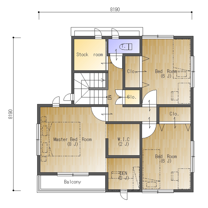 北玄関、東西の間口4.5間(8190㎜)、南北の奥行が4.5間(8190㎜)の参考プランです。