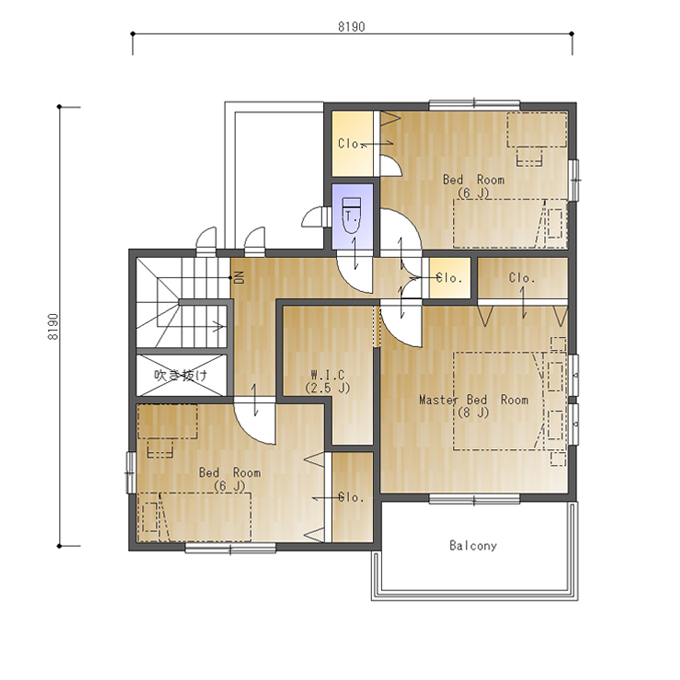 主寝室は8帖、キングサイズのベッドを置いても十分な広さ。2.5帖のウォークインクロゼットで収納もしっかり確保。主寝室とつながる奥行の深いバルコニーはアウトドアリビングにもなります。休日は眺めの良いバルコニーでくつろぐのもいいですね