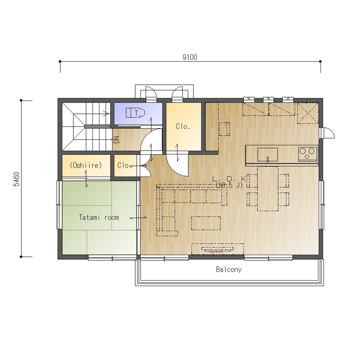 北玄関、間口が5.0間(9100㎜)、奥行が3.0間(5460㎜)の参考プランです。