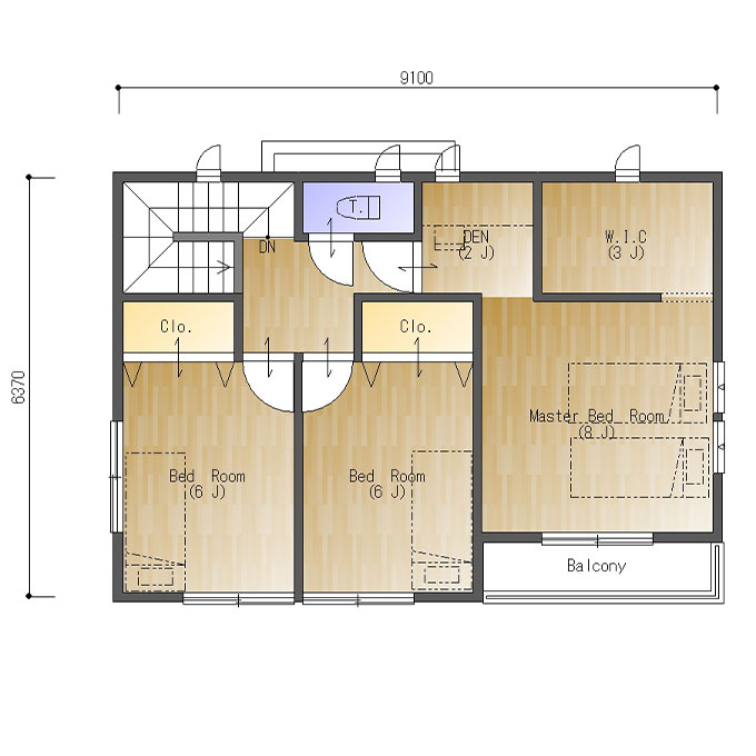 二階に8帖の主寝室と6帖の洋室二室を配置。バルコニーに面した主寝室には3帖のウォークインクロゼットと、2帖の書斎を備えています。ホール部分に各部屋への出入り口を集めることで廊下スペースを減らし、広い個室と十分な収納スペースを確保した機能的な間取りです。