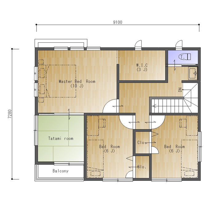 主寝室から続いている和室は、洗濯物をたたむ家事スペースにしたり、横になって仕事で疲れた心身を癒したりするのにピッタリです。ウォークインクロゼットは3帖あるので、収納にも困りません。