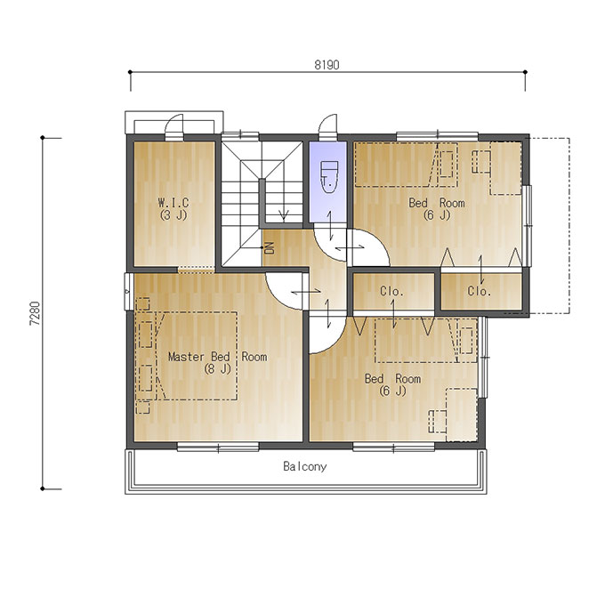 二階の部屋はいずれも角部屋で通風・採光に配慮されています。各部屋にクロゼットがあるため、収納にも困りませんね。