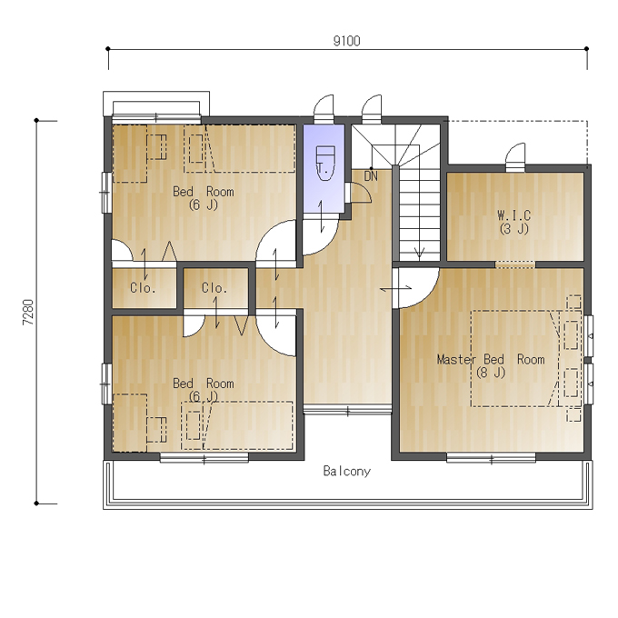 二階は三部屋。8畳の主寝室には3畳のウォークインクローゼットがあり収納も十分。