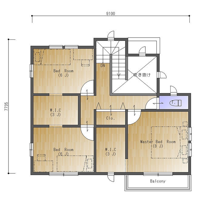 二階は三部屋。8畳の主寝室には3畳のウォークインクローゼットがあり収納も十分。
