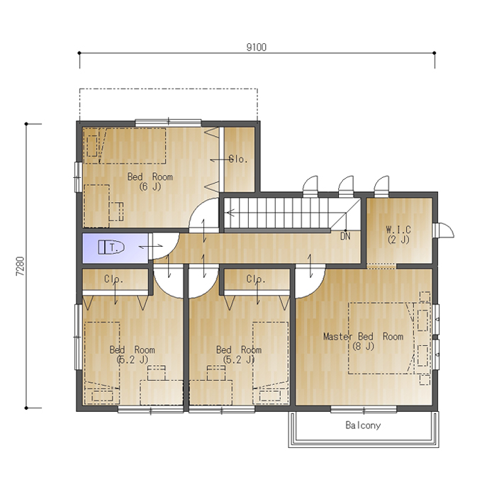 二階は四部屋。8畳の主寝室には2畳のウォークインクローゼットがあり収納も十分。廊下を最小限にすることで、二階にもトイレを配置できます。各部屋に1畳のクローゼットがあり収納のある子供部屋として使い勝手の良い間取りとなっています。