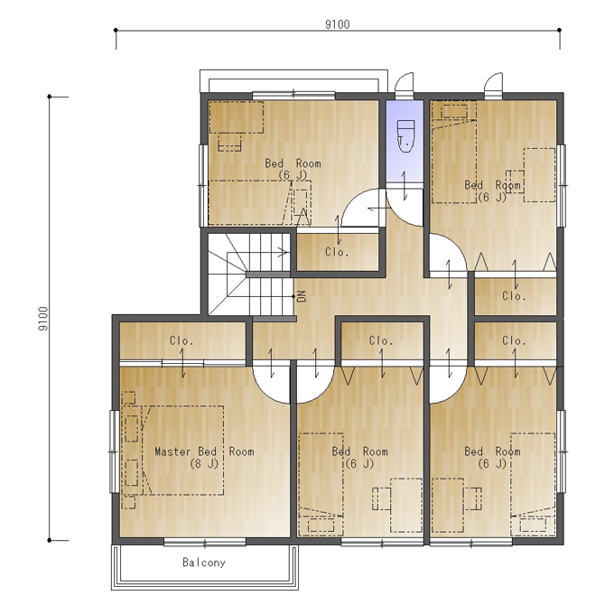 二階は5部屋と部屋数は多いものの、主寝室は8帖、子供部屋は6帖プラス収納付きの大きさを確保。大家族におすすめの間取りです。家族が多いと二階にもトイレがあるのは嬉しいですね。