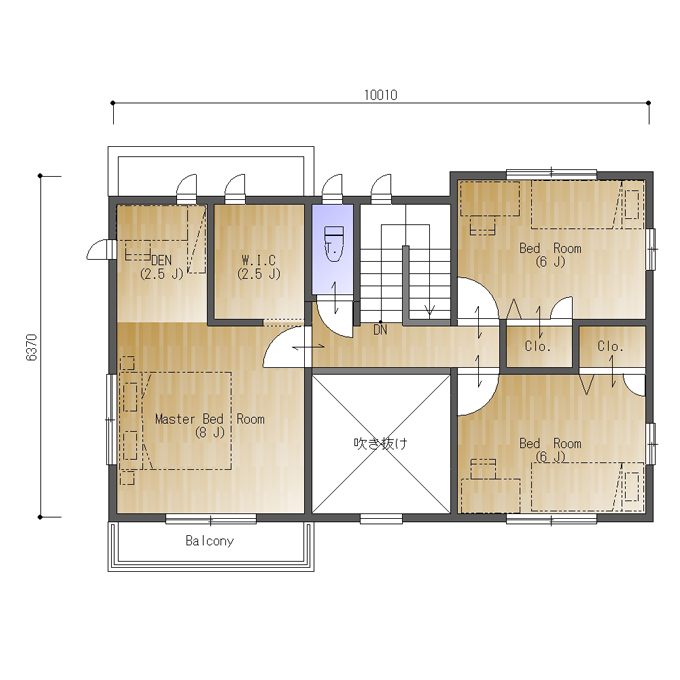 2階は3部屋、全て角部屋です。廊下を最小限にすることで2階にもトイレを配置できます。8帖の主寝室にはウォークインクロゼットと書斎も設置。リモートワークが増加している昨今、専用のスペースが確保できるのは嬉しいポイント。プライベートな自分だけの空間を作ることができる充実した寝室となっています。