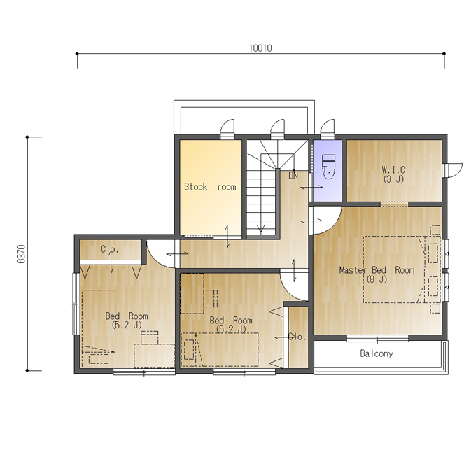 2階の廊下には大きなストックルームを配置。日用品や家電、掃除道具等あらゆるものを収納できる大きさです。2つの子供部屋はそれぞれ5.2帖。クロゼットを設置してあるので、収納家具を置かずにすみ、お部屋を広く使えます。主寝室は8帖、ウォークインクロゼットがついています。