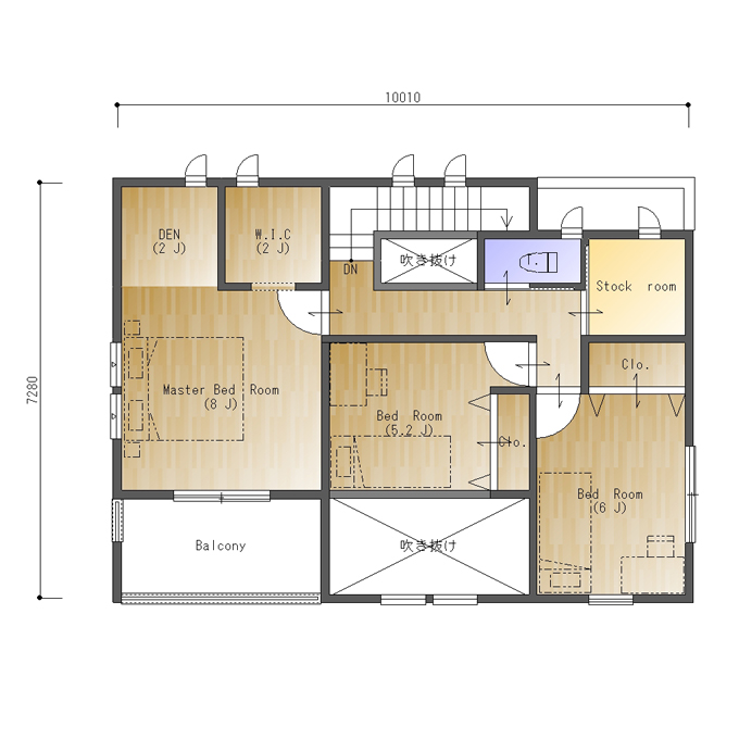 2階の子供部屋2部屋にはそれぞれクロゼットがあるほか、約2帖のストックルームがあり、収納スペースは抜群です。8帖の主寝室の隣には、ウォークインクロゼット、リモートワークに活用できる2帖の書斎スペースも設けられています。